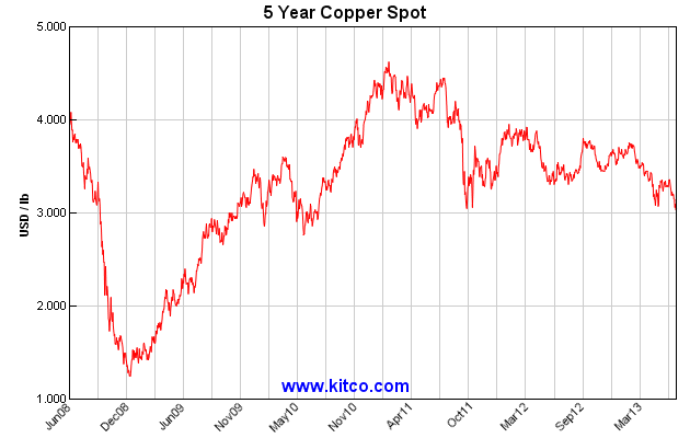 高盛(Goldman Sachs)周二宣布下調今、明兩年銅價預估,將 2013 年平均銅價下調 5.1% 至每噸 7216 美元,2014年下調 4.7% 至每噸 6600 美元。